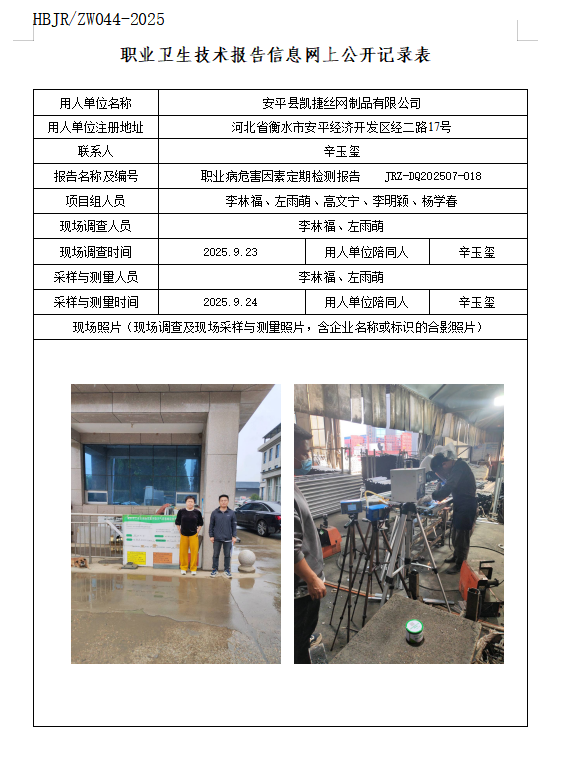 安平县凯捷丝网制品有限公司职业卫生技术报告信息网上公开记录表