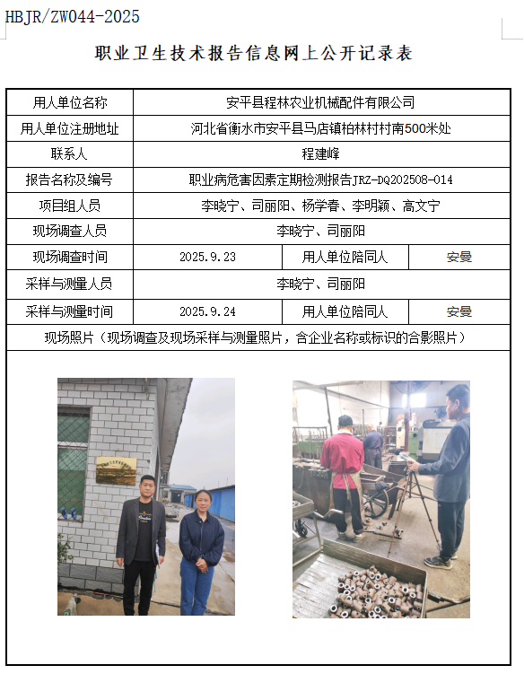 安平县程林农业机械配件有限公司职业卫生技术报告信息网上公开记录表