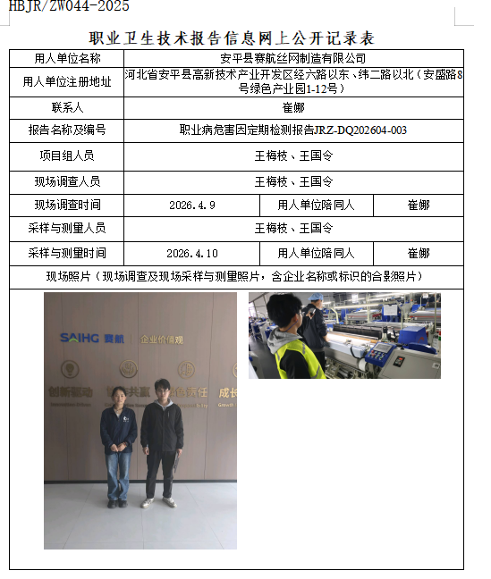安平县赛航丝网制造有限公司职业卫生技术报告信息网上公开记录表
