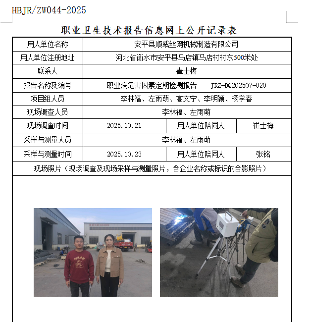 安平县顺威丝网机械制造有限公司职业卫生技术报告信息网上公开记录表