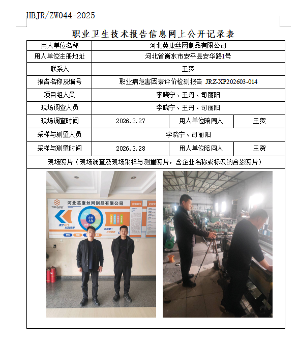 河北英康丝网制品有限公司职业卫生技术报告信息网上公开记录表