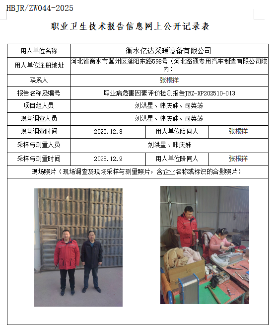 衡水亿达采暖设备有限公司职业卫生技术报告信息网上公开记录表