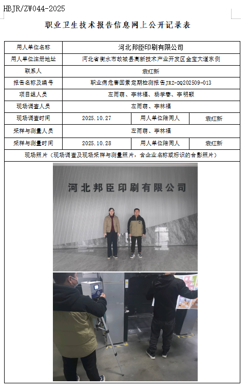 河北邦臣印刷有限公司职业卫生技术报告信息网上公开记录表
