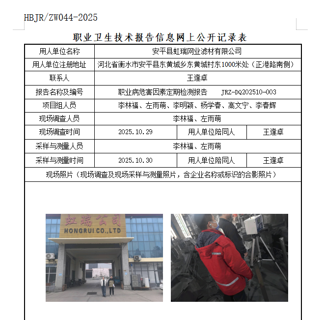 安平县虹瑞网业滤材有限公司职业卫生技术报告信息网上公开记录表
