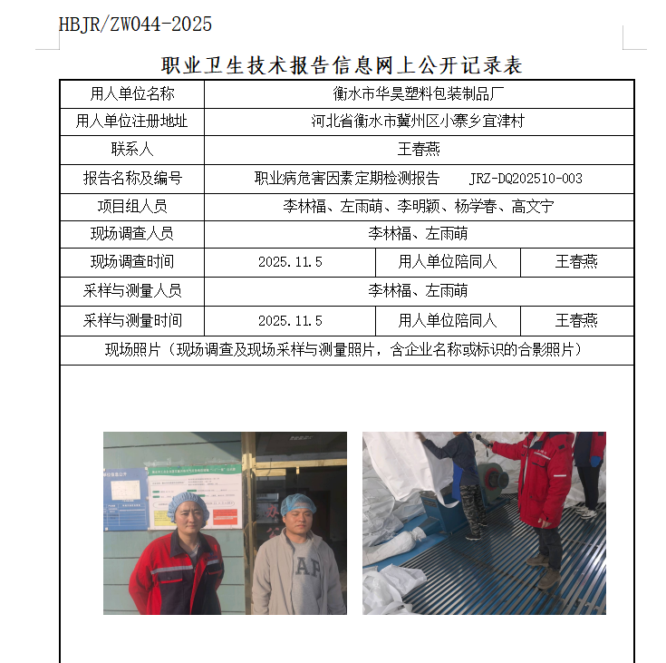 衡水市华昊塑料包装制品厂职业卫生技术报告信息网上公开记录表