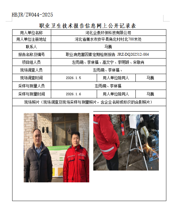 河北企泰环保科技有限公司职业卫生技术报告信息网上公开记录表