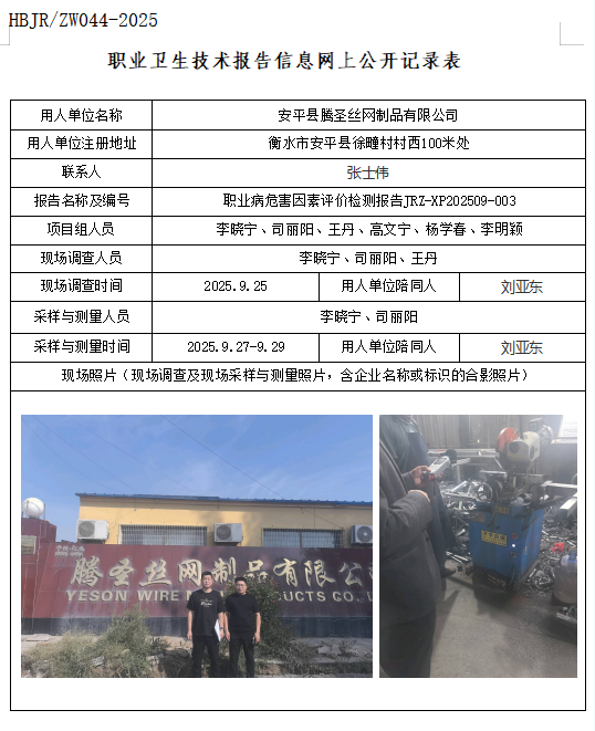 安平县腾圣丝网制品有限公司职业卫生技术报告信息网上公开记录表