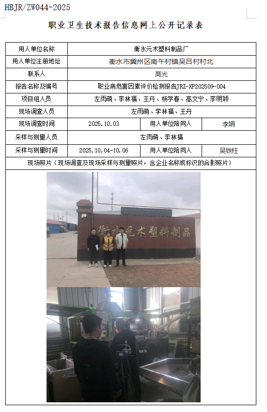 衡水元术塑料制品厂职业卫生技术报告信息网上公开记录表